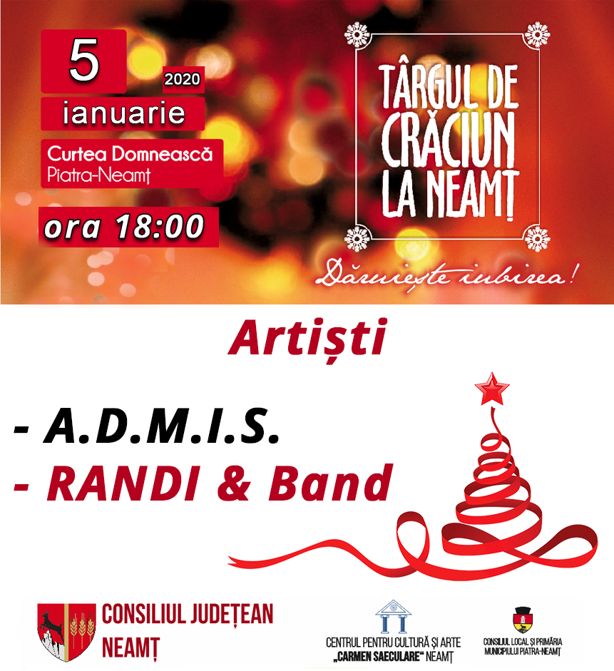 Duminică 5 ianuarie orele 18:00 , scena de pe platoul Curții Domnești va găzdui o nouă serie de artiști. Vă așteptăm în număr cât mai mare să sărbatorim împreună festivalul Târgul de Crăciun la Neamț ediția IV. Este ultima zi din Târgul de Crăciun la Neamț organizat de Centrul pentru Cultură şi Arte „Carmen Saeculare”.