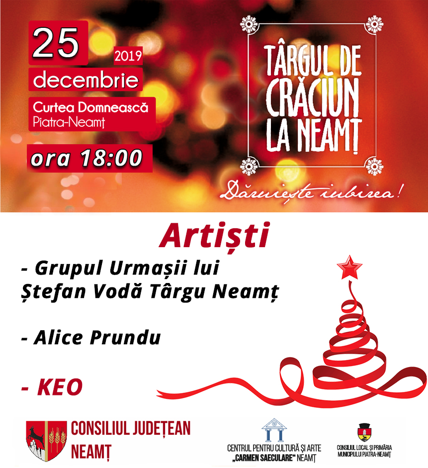 Miercuri 25 decembrie orele 18:00 , scena de pe platoul Curții Domnești va găzdui o nouă serie de artiști. Vă așteptăm în număr cât mai mare să sărbatorim împreună festivalul Târgul de Crăciun la Neamț ediția IV.
