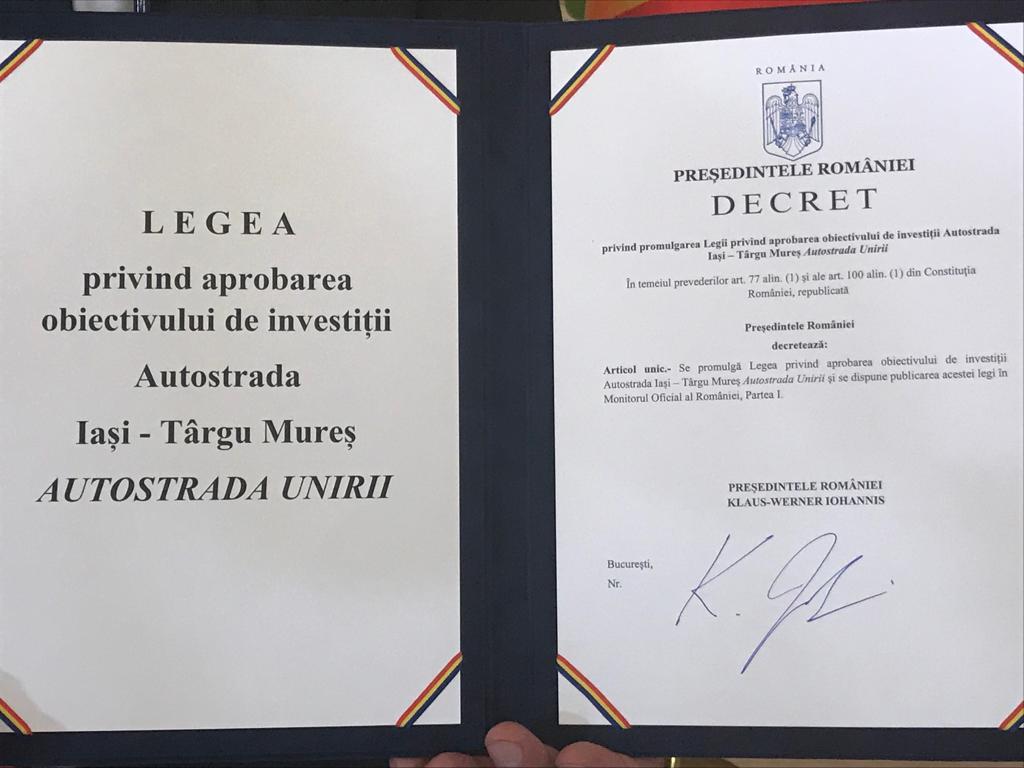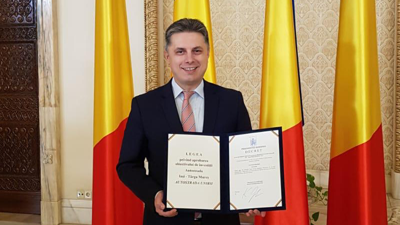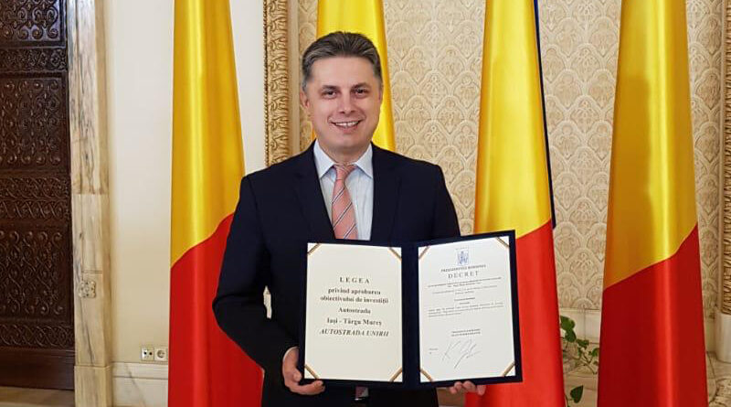 De asemenea, a fost unul dintre inițiatorii proiectului de lege privind aprobarea obiectivului de investiții Autostrada Iași – Târgu Mureș – „Autostrada Unirii”. În anul Centenarului, se afla alături de președintele României Klaus Iohannis la ceremonia publică prin care a fost marcat momentul promulgării Legii privind aprobarea obiectivului de investiții Autostrada Iași – Târgu Mureș – „Autostrada Unirii”. Asta a fost o dovadă a interesului manifestat pentru acest proiect la cel mai înalt nivel de reprezentare al statului român.