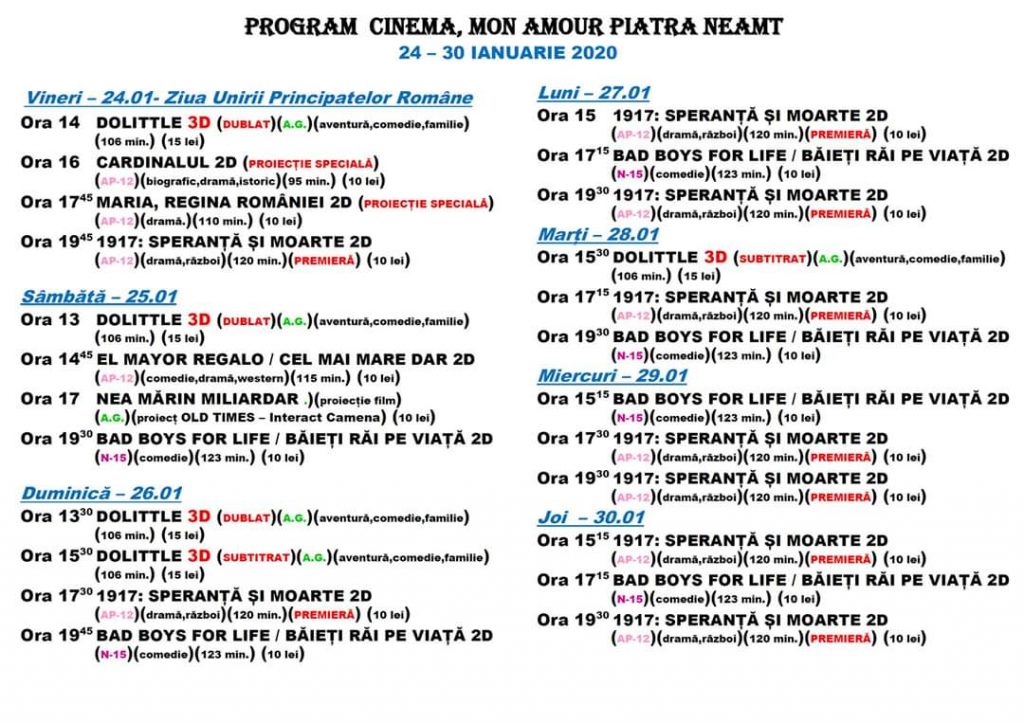 Programul filmelor de la Cinema Mon Amour (Dacia) Piatra Neamț în perioada 24 – 30 ianuarie 2020.