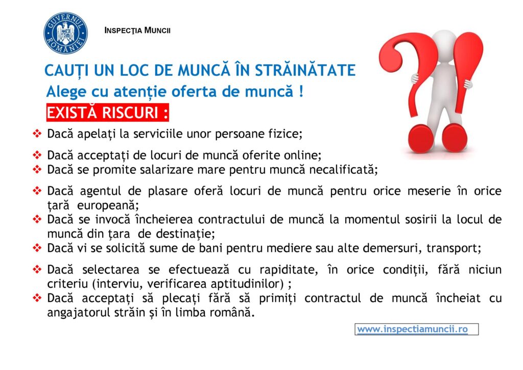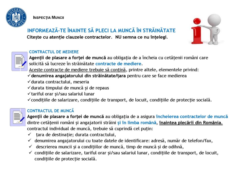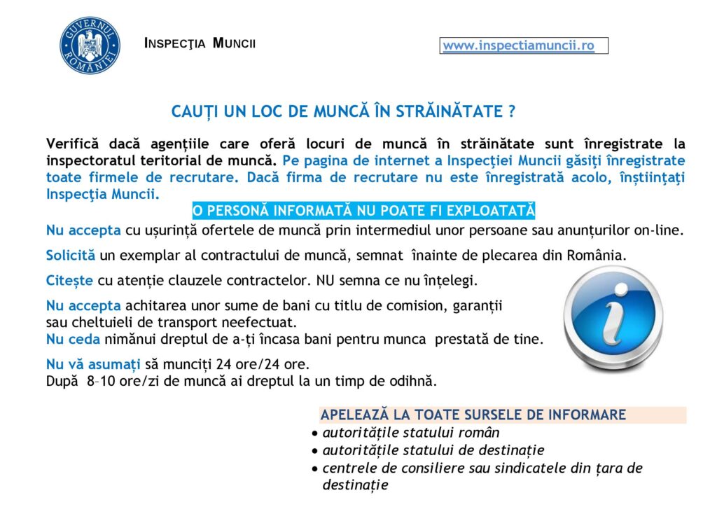 Material informativ elaborat de Inspecția Muncii, cu privire la drepturile, obligațiile și riscurile la care se expun cetățenii români care intenționează să muncească în străinătate, inclusiv ca lucrători sezonieri.