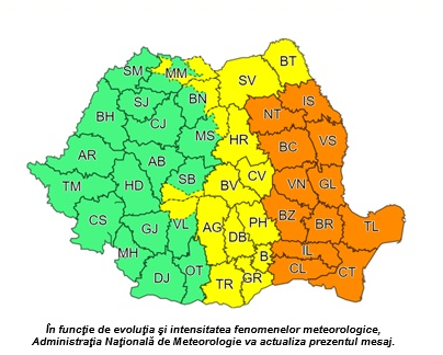 În intervalul 15 iunie, ora 12:00 – 16 iunie, ora 23:00, în Dobrogea, jumătatea de est a Munteniei și în cea mai mare parte a Moldovei, vor fi perioade în care se vor semnala averse torențiale, descărcări electrice, intensificări de scurtă durată ale vântului și izolat, grindină.