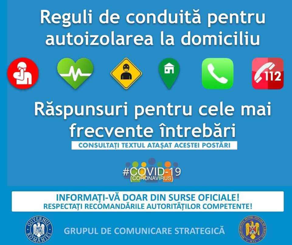 ? În cazul în care, pe parcursul celor 14 zile, vreun membru al familiei prezintă simptome sugestive pentru infecția cu coronavirus (febră, tuse, dificultate în respirație) sau prezintă orice altă urgență medicală, contactați medicul de familie și/sau sunați la 112. Menționați, obligatoriu, că vă aflați în situația de autoizolare la domiciliu!