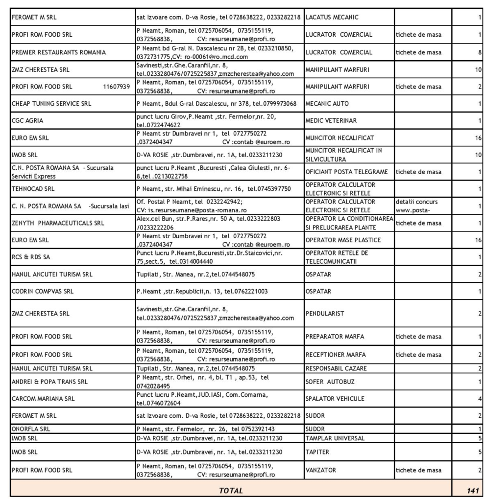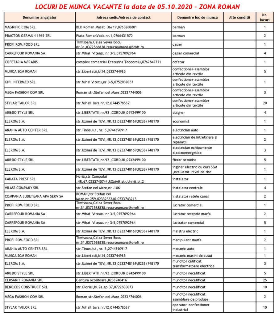 Noi locuri de muncă vacante în Piatra Neamț, Roman și Târgu Neamț – 3 octombrie