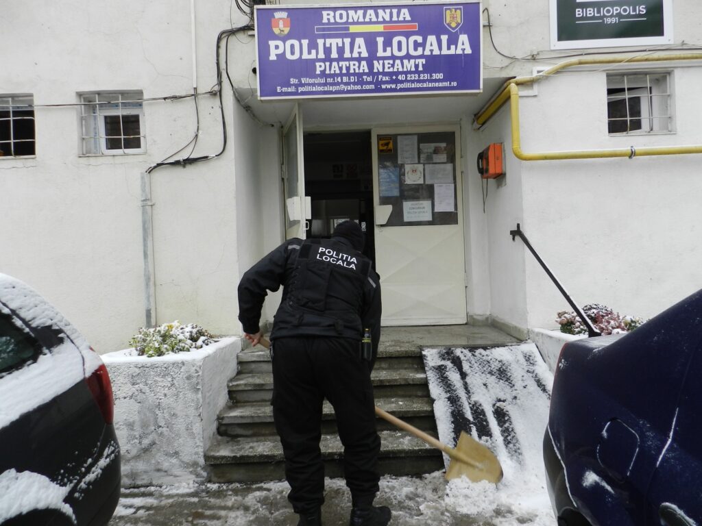 Polițiștii din cadrul Poliției Locale Piatra Neamț, au început curățarea trotuarelor din fața sediului Poliției Locale.