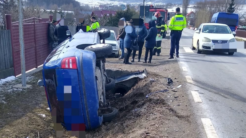 Autoturism răsturnat. Două victime transportate la spital