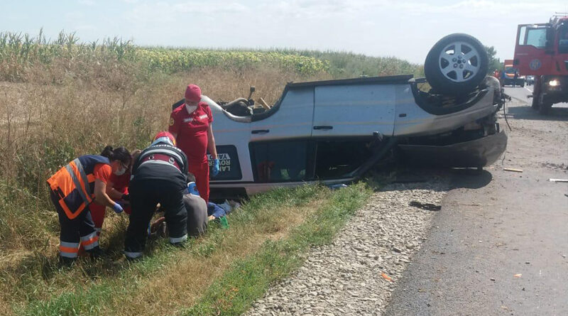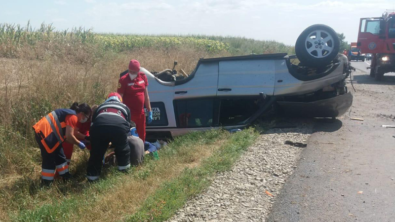 În urma accidentului rutier produs între două autoturisme un autoturism s-a răsturnat, rezultând două victime, conștiente.