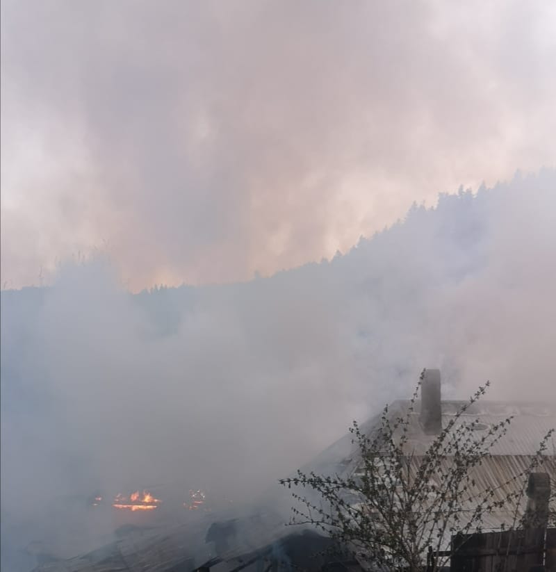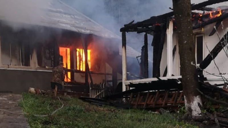 Incendiul se manifesta generalizat la nivelul unei case și la nivelul acoperișului de la o casă din imediata apropiere.
