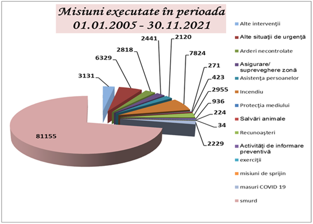 În perioada 01.01.2005-30.11.2021, în zona de competenţă a Inspectoratului pentru Situaţii de Urgenţă „Petrodava” al judeţului Neamţ s-au produs 112890 de evenimente care au necesitat intervenţia serviciilor profesioniste, voluntare şi private pentru situaţii de urgenţă (în medie 18,27 pe zi), din care: